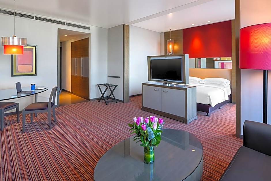 This suite offers a partitioned bedroom in living area and faces either Sheikh Zayed Bridge or Khalifa Park. Each Suite has a large walk-in shower, mini-bar, tea and coffee making facilities. All rooms are equipped with multi satellite 40 inch LCD TV, high speed wireless internet access, 2 IP phones in the bedroom , Club Lounge Access, buffet breakfast and Internet access in Lounge is complimentary.